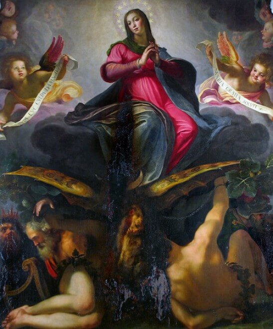 양옆의 천사들이 들고 있는 라틴어 문구는 마리아의 순결함을 찬양하는 내용을 담고 있으며 이는 **’제2의 하와’**로서 인류의 원죄를 씻어내는 마리아의 역할을 강조한다.