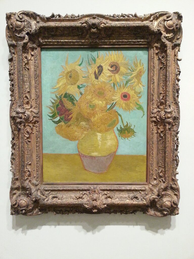 이 작품은 미국 **필라델피아 미술관(Philadelphia Museum of Art)**이 소중히 품고 있는 걸작, **<열두 송이 해바라기>**이며 차분한 청록색(Turquoise) 배경이 노란 꽃잎을 더욱 선명하게 받쳐주고 있다.